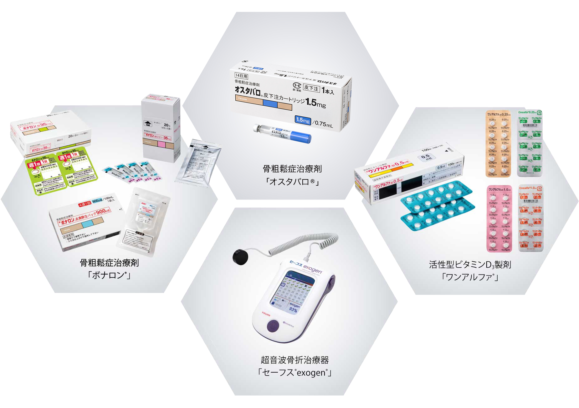 骨粗鬆症に対する認知度が低かった1980年代にいち早く対策を始めました。まず診断方法から独自に開発。続いて骨量の増加を促す活性型ビタミンD₃製剤「ワンアルファ®」、骨の破壊を防ぐ骨粗鬆症治療剤「ボナロン®」を展開し、剤形も増やしました。在宅医療では超音波骨折治療器「セーフス®exogen®」をラインナップに加え、2023年に骨粗鬆症治療剤として「オスタバロ®」を発売いたしました。